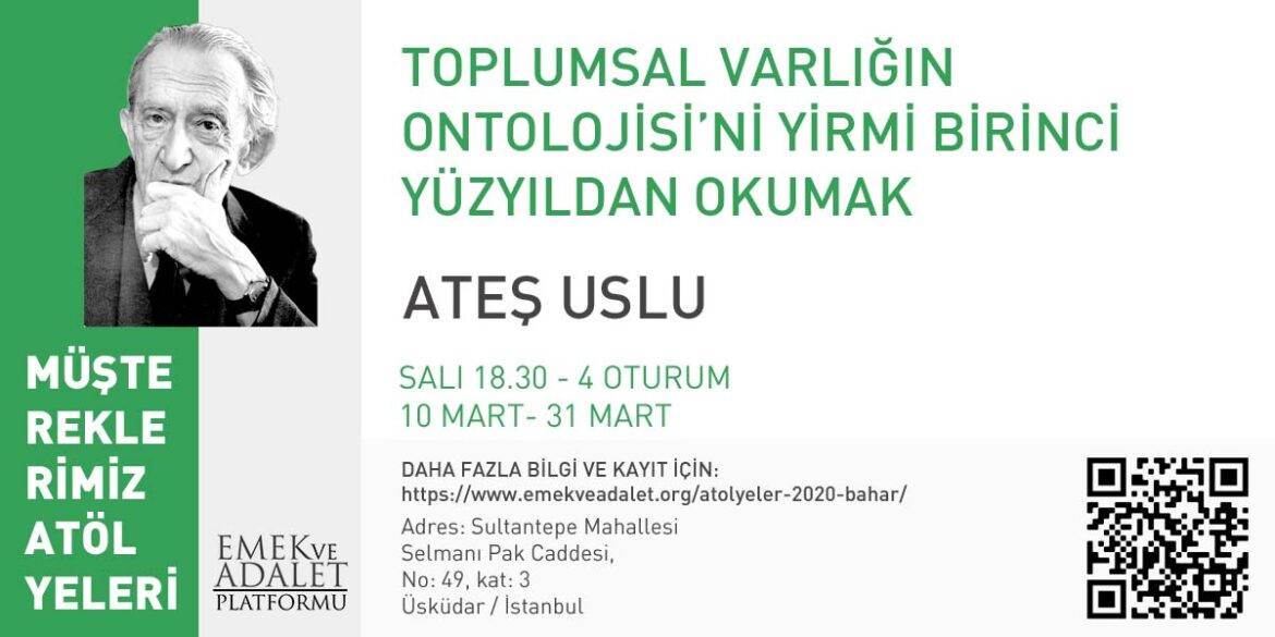 Toplumsal Varlığın Ontolojisi’ni Yirmi Birinci Yüzyıldan Okumak > Ateş Uslu 10 Mart 2020 0 Etkinlik Detayları Tarih: 10 Mart 2020 18:30 – 22:30 FacebookTwitterLinkedinWhatsappEmail